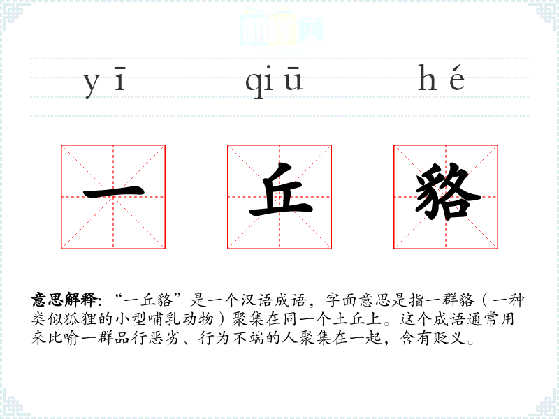 在文学作品中,“一丘貉”常用来讽刺那些勾结在一起做坏事的人。在口语中,这个成语可能用来形容某个团体或朋友圈子里的成员都是不值得信任的人。在专业领域,如法律或政治评论中,这个成语可能用来批评某些团体或组织的腐败行为。