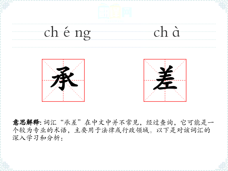 词汇“承差”在中文中并不常见,经过查询,它可能是一个较为专业的术语,主要用于法律或行政领域。以下是对该词汇的深入学*和分析:
