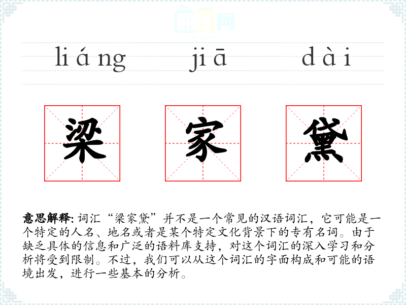 - 理解:“梁家黛”作为一个词汇,其具体含义和使用场景可能需要更多的背景信息来确定。