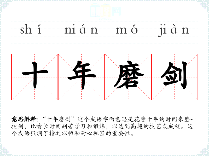 “十年磨剑”这个成语字面意思是花费十年的时间来磨一把剑,比喻长时间刻苦学*和锻炼,以达到高超的技艺或成就。这个成语强调了持之以恒和耐心积累的重要性。