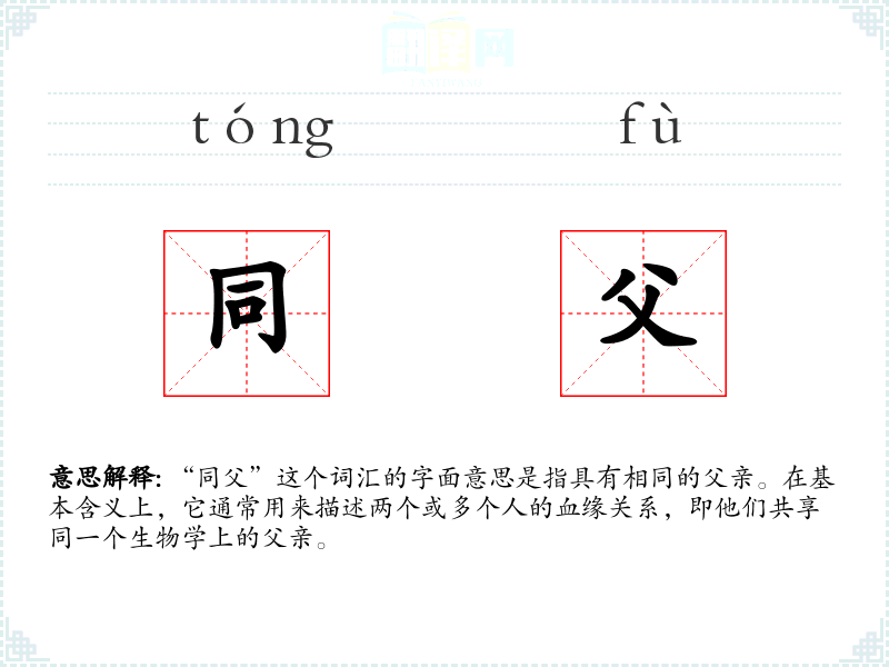 “同父”这个词汇的字面意思是指具有相同的父亲。在基本含义上,它通常用来描述两个或多个人的血缘关系,即他们共享同一个生物学上的父亲。