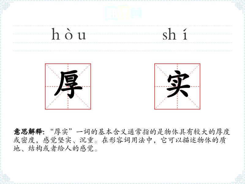 “厚实”一词的基本含义通常指的是物体具有较大的厚度或密度,感觉坚实、沉重。在形容词用法中,它可以描述物体的质地、结构或者给人的感觉。