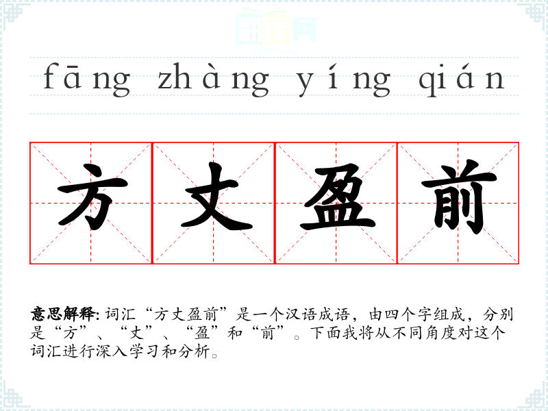 词汇“方丈盈前”是一个汉语成语,由四个字组成,分别是“方”、“丈”、“盈”和“前”。下面我将从不同角度对这个词汇进行深入学*和分析。