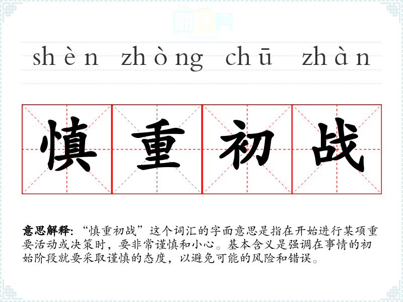“慎重初战”这个词汇的字面意思是指在开始进行某项重要活动或决策时,要非常谨慎和小心。基本含义是强调在事情的初始阶段就要采取谨慎的态度,以避免可能的风险和错误。