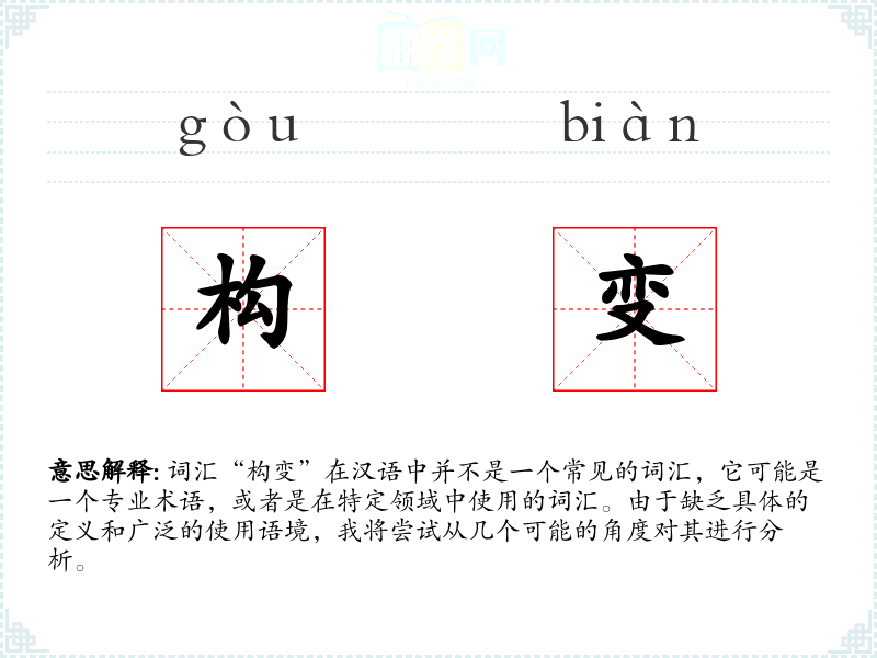词汇“构变”在汉语中并不是一个常见的词汇,它可能是一个专业术语,或者是在特定领域中使用的词汇。由于缺乏具体的定义和广泛的使用语境,我将尝试从几个可能的角度对其进行分析。