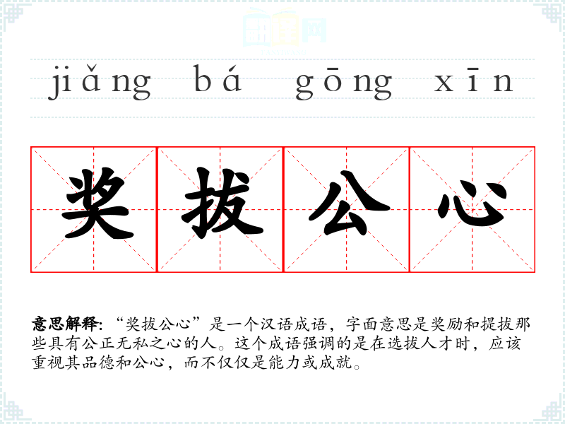“奖拔公心”这个成语强调了在选拔人才时公正和无私的重要性。它不仅是一种选拔原则,也是一种社会价值观的体现。在语言学*和表达中,理解和运用这个成语可以帮助我们更好地传达公正和无私的理念。