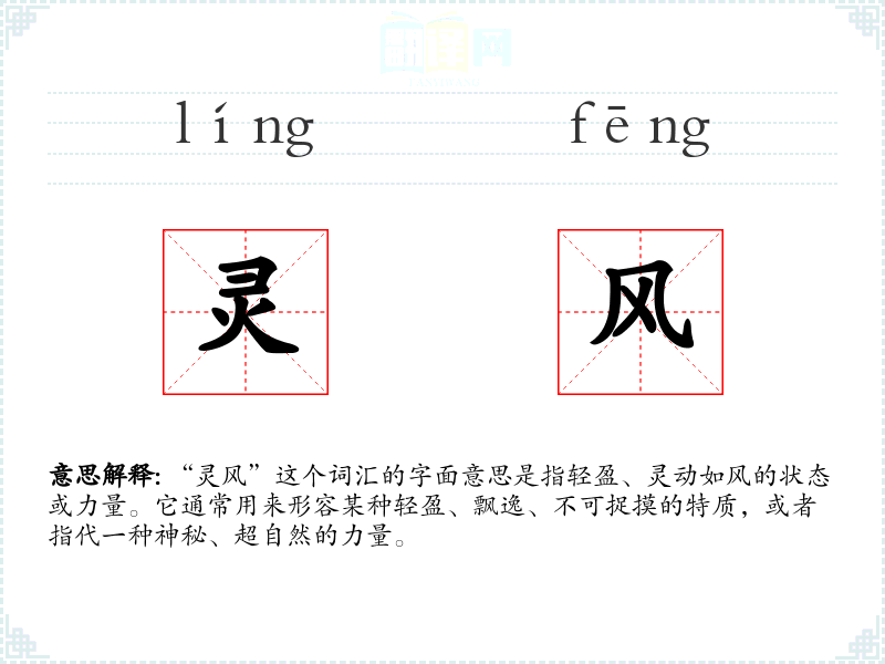 在文学中,“灵风”常用来形容人物的飘逸、超凡脱俗的气质,或者形容自然界中风的轻盈、灵动。在口语中,它可能被用来形容某人的举止或动作轻盈优雅。在专业领域,如气象学或物理学中,这个词汇可能不常用,除非是在比喻或象征性的语境中。