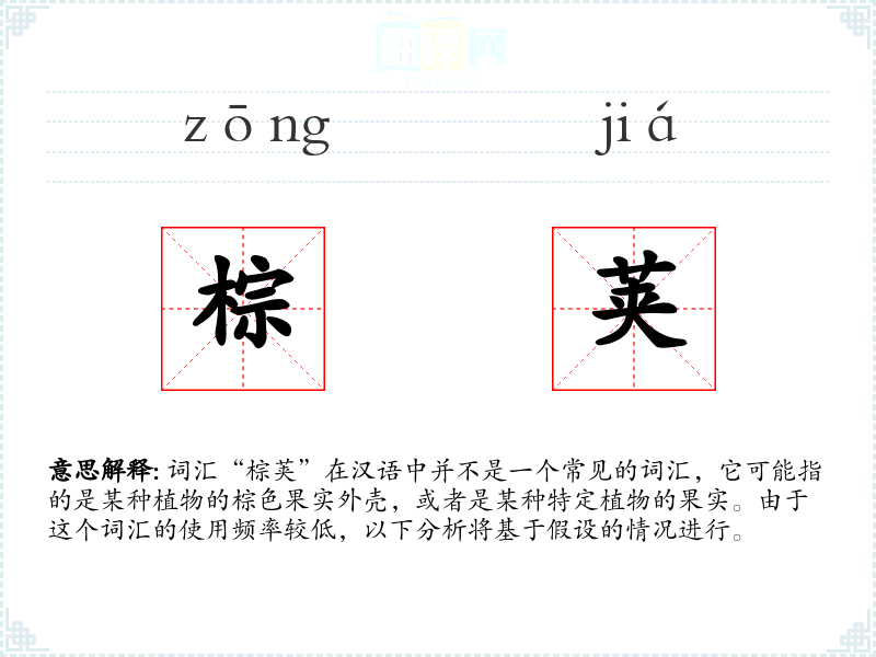词汇“棕荚”在汉语中并不是一个常见的词汇,它可能指的是某种植物的棕色果实外壳,或者是某种特定植物的果实。由于这个词汇的使用频率较低,以下分析将基于假设的情况进行。