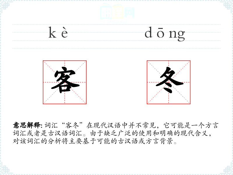 词汇“客冬”在现代汉语中并不常见,它可能是一个方言词汇或者是古汉语词汇。由于缺乏广泛的使用和明确的现代含义,对该词汇的分析将主要基于可能的古汉语或方言背景。