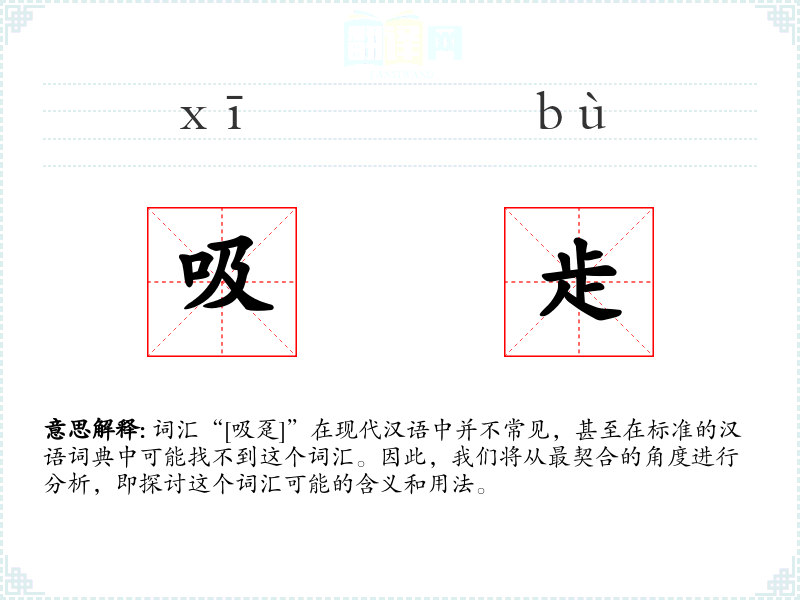 由于“[吸趸]”不是一个标准的汉语词汇,我们无法给出一个确切的字面意思和基本含义。但是,我们可以推测它可能是由“吸”和“趸”两个字组合而成的。