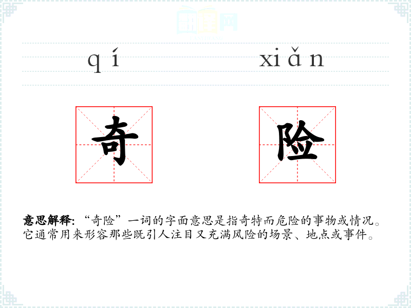 “奇险”由“奇”和“险”两个字组成。“奇”字古汉语中意为不寻常、罕见,“险”字则指危险、不安全。这两个字组合在一起,强调了既罕见又危险的特点。在古代文献中,这个词常用于描述自然景观或军事地形。