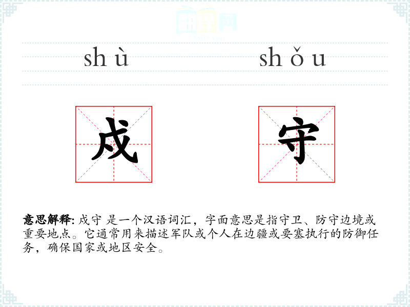 戍守 是一个汉语词汇,字面意思是指守卫、防守边境或重要地点。它通常用来描述军队或个人在边疆或要塞执行的防御任务,确保国家或地区安全。