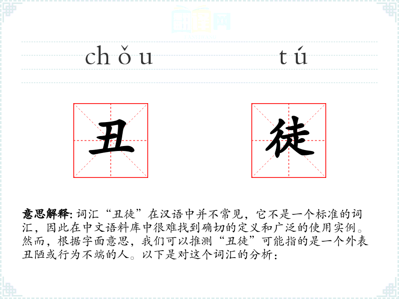 - 字面意思:由“丑”和“徒”两个字组成。“丑”通常指外貌不美观或不协调,而“徒”可以指人或追随者。