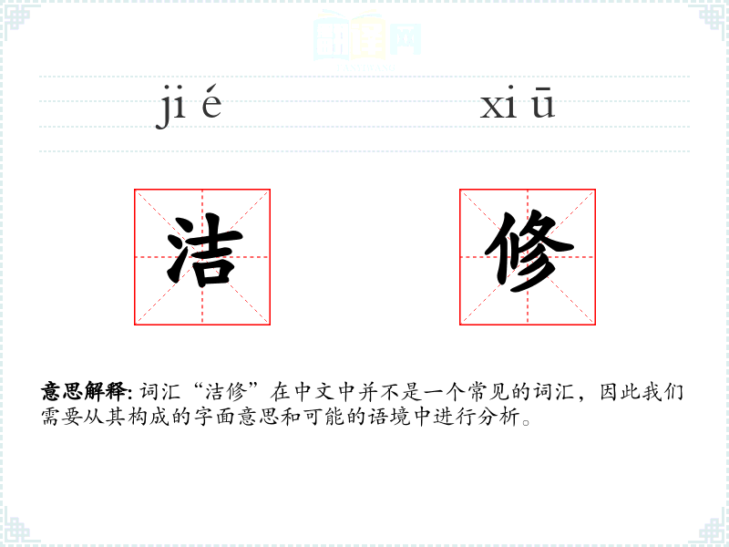 词汇“洁修”在中文中并不是一个常见的词汇,因此我们需要从其构成的字面意思和可能的语境中进行分析。