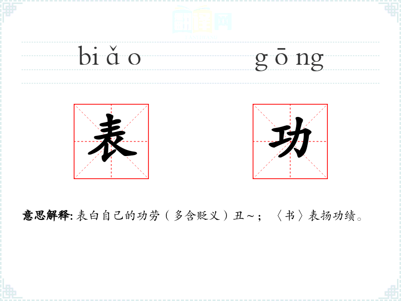 表白自己的功劳(多含贬义)丑~; 〈书〉表扬功绩。