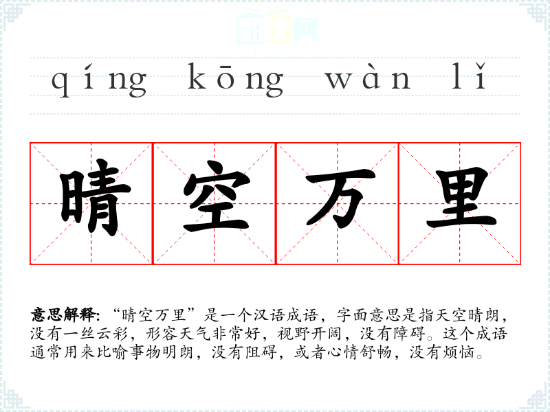 “晴空万里”是一个汉语成语,字面意思是指天空晴朗,没有一丝云彩,形容天气非常好,视野开阔,没有障碍。这个成语通常用来比喻事物明朗,没有阻碍,或者心情舒畅,没有烦恼。