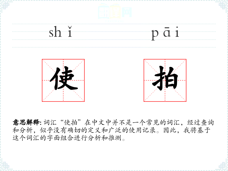 尽管“使拍”不是一个标准词汇,通过对其字面意思的分析和推测,我们可以理解它可能在特定领域内有其特定的使用。在语言学习和表达中,了解和掌握词汇的正确用法是非常重要的,特别是对于专业术语。