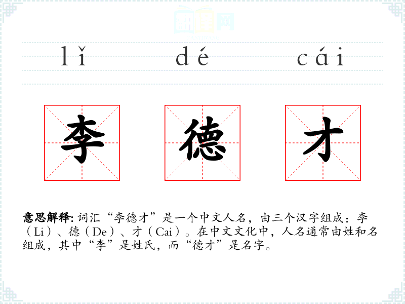 词汇“李德才”是一个中文人名,由三个汉字组成:李(Li)、德(De)、才(Cai)。在中文文化中,人名通常由姓和名组成,其中“李”是姓氏,而“德才”是名字。