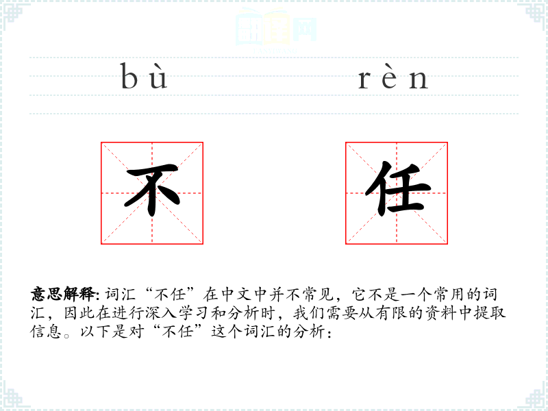 词汇“不任”在中文中并不常见,它不是一个常用的词汇,因此在进行深入学*和分析时,我们需要从有限的资料中提取信息。以下是对“不任”这个词汇的分析:
