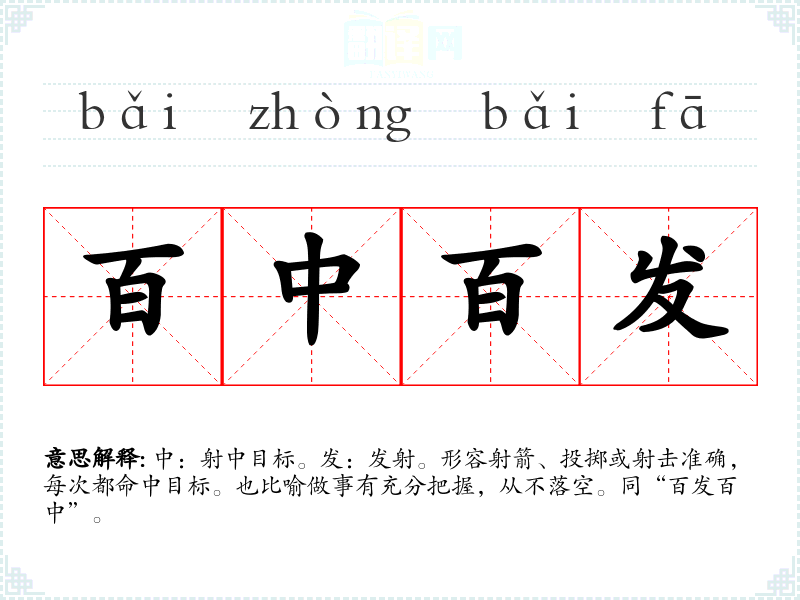 中:射中目标。发:发射。形容射箭、投掷或射击准确,每次都命中目标。也比喻做事有充分把握,从不落空。同“