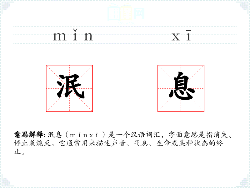 泯息(mǐn xī)是一个汉语词汇,字面意思是指消失、停止或熄灭。它通常用来描述声音、气息、生命或某种状态的终止。