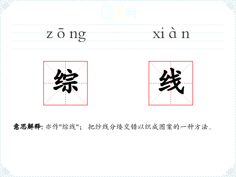 亦作"综线"; 把纱线分缕交错以织成图案的一种方法。