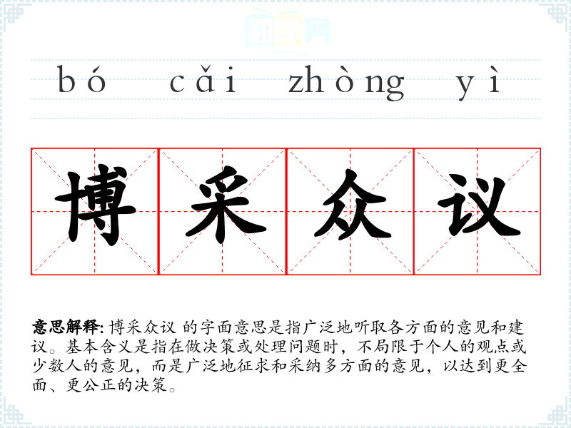 博采众议 这个词汇源自**古代的治国理念,强调君主或领导者应该广泛听取臣民的意见。随着时间的推移,这个词组被广泛应用于各种需要集体智慧和民主决策的场合。