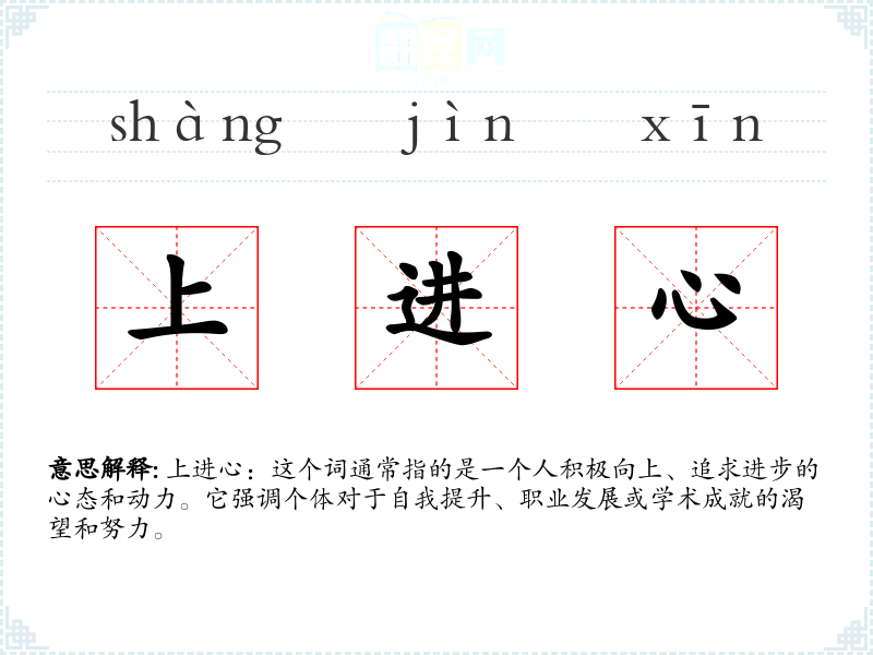 上进心:这个词通常指的是一个人积极向上、追求进步的心态和动力。它强调个体对于自我提升、职业发展或学术成就的渴望和努力。