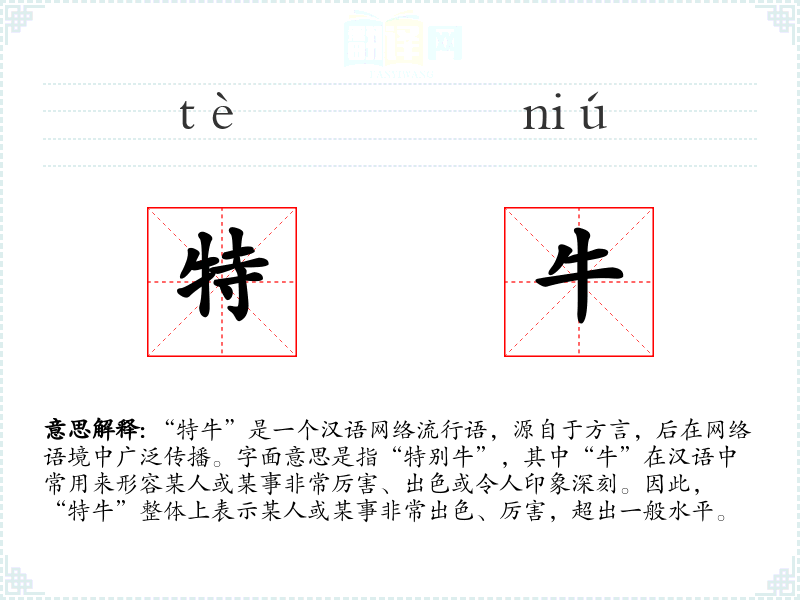 “特牛”是一个汉语网络流行语,源自于方言,后在网络语境中广泛传播。字面意思是指“特别牛”,其中“牛”在汉语中常用来形容某人或某事非常厉害、出色或令人印象深刻。因此,“特牛”整体上表示某人或某事非常出色、厉害,超出一般水平。