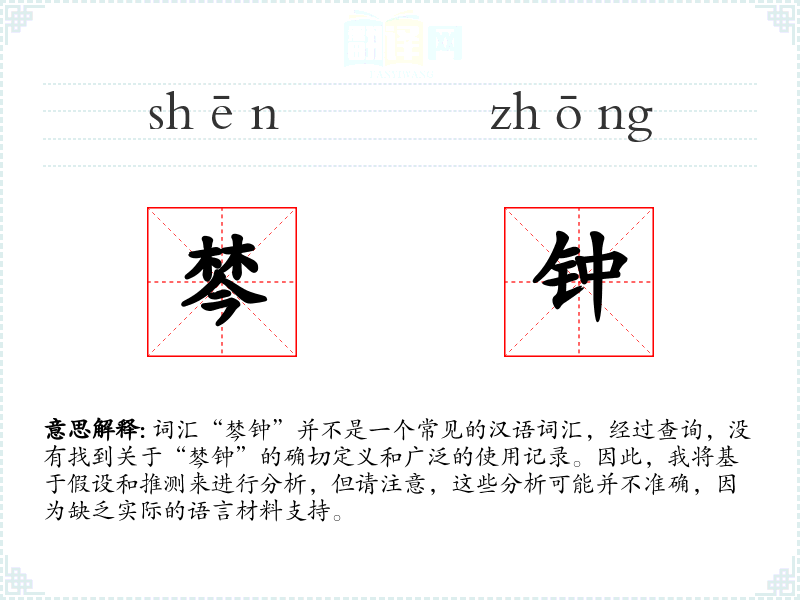 由于“棽钟”不是一个标准词汇,我们无法给出确切的字面意思和基本含义。如果“棽”和“钟”分别解释,“棽”可能是一个生僻字或方言字,而“钟”通常指一种计时器或乐器。
