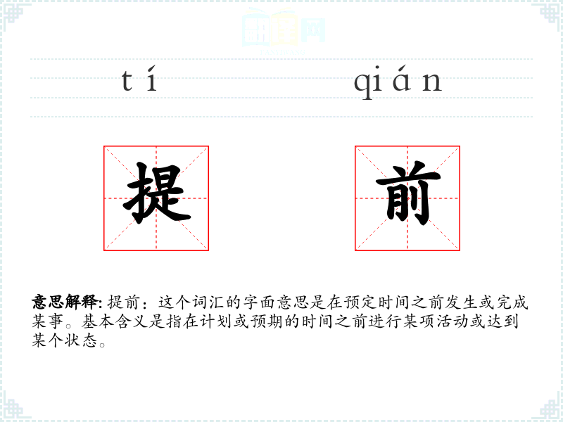 “提前”一词在中文中历史悠久,由“提”和“前”两个字组成,“提”有举起、引领之意,“前”指前方或时间上的早。在现代汉语中,这个词的使用和意义基本保持稳定。