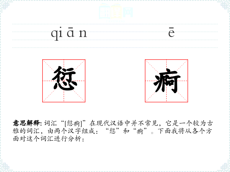 词汇“[愆痾]”在现代汉语中并不常见,它是一个较为古雅的词汇,由两个汉字组成:“愆”和“痾”。下面我将从各个方面对这个词汇进行分析: