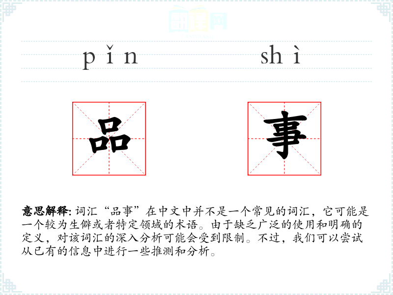 词汇“品事”在中文中并不是一个常见的词汇,它可能是一个较为生僻或者特定领域的术语。由于缺乏广泛的使用和明确的定义,对该词汇的深入分析可能会受到限制。不过,我们可以尝试从已有的信息中进行一些推测和分析。