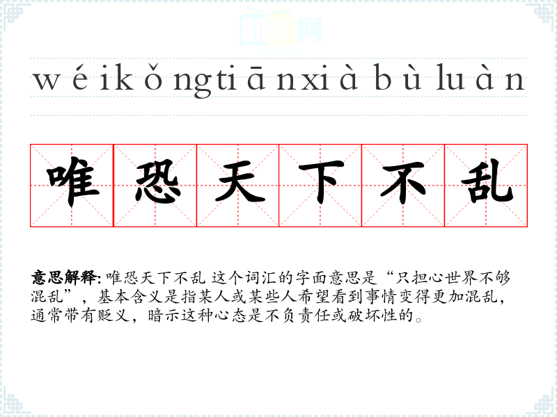 唯恐天下不乱 这个词汇的字面意思是“只担心世界不够混乱”,基本含义是指某人或某些人希望看到事情变得更加混乱,通常带有贬义,暗示这种心态是不负责任或破坏性的。