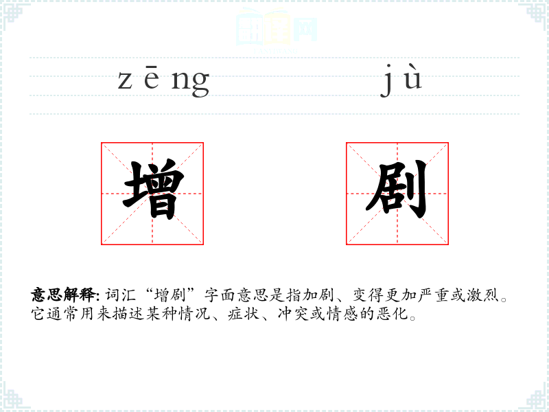 词汇“增剧”字面意思是指加剧、变得更加严重或激烈。它通常用来描述某种情况、症状、冲突或情感的恶化。