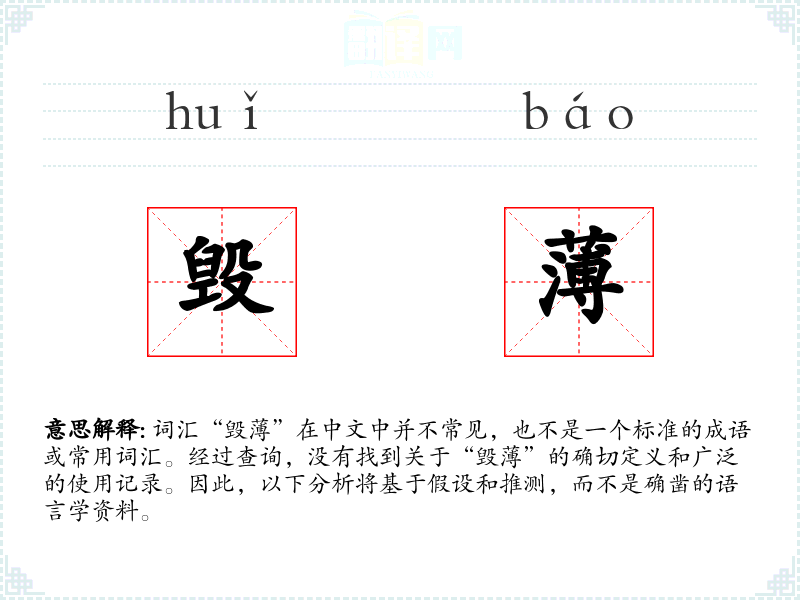 词汇“毁”在中文中并不常见,也不是一个标准的成语或常用词汇。经过查询,没有找到关于“毁”的确切定义和广泛的使用记录。因此,以下分析将基于假设和推测,而不是确凿的语言学资料。