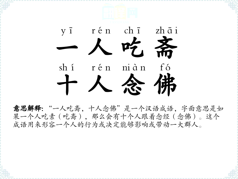 “一人吃斋,十人念佛”是一个汉语成语,字面意思是如果一个人吃素(吃斋),那么会有十个人跟着念经(念佛)。这个成语用来形容一个人的行为或决定能够影响或带动一大群人。