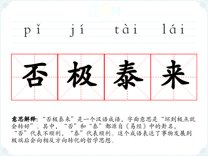 “否极泰来”是一个汉语成语,字面意思是“坏到极点就会转好”。其中,“否”和“泰”都源自《易经》中的卦名,“否”代表不顺利,“泰”代表顺利。这个成语表达了事物发展到极端后会向相反方向转化的哲学思想。