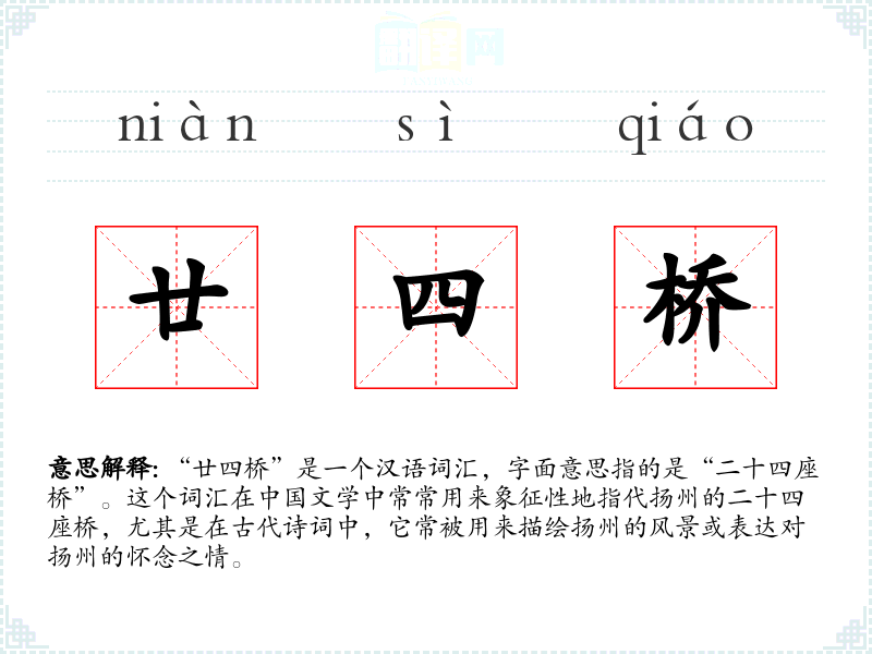 同义词:二十四桥、扬州桥、江南桥 反义词:这个词汇没有直接的反义词,因为它更多是一个特定地点的象征,而不是一个具有对比意义的词汇。