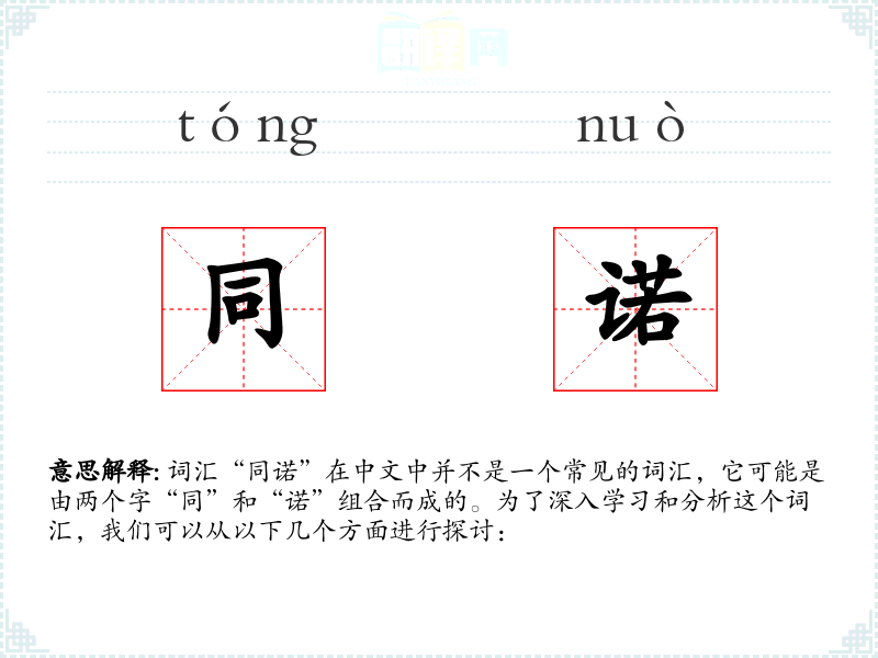 词汇“同诺”在中文中并不是一个常见的词汇,它可能是由两个字“同”和“诺”组合而成的。为了深入学习和分析这个词汇,我们可以从以下几个方面进行探讨: