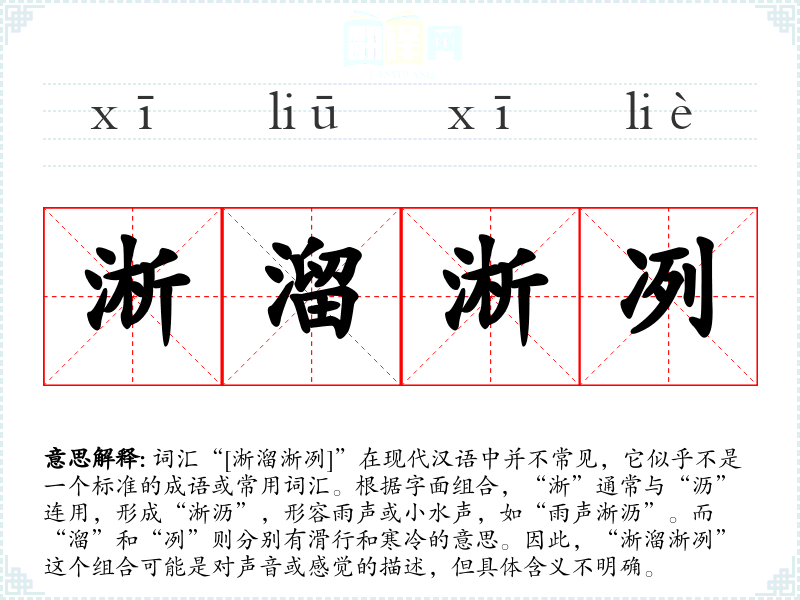 词汇“[淅溜淅冽]”在现代汉语中并不常见,它似乎不是一个标准的成语或常用词汇。根据字面组合,“淅”通常与“沥”连用,形成“淅沥”,形容雨声或小水声,如“雨声淅沥”。而“溜”和“冽”则分别有滑行和寒冷的意思。因此,“淅溜淅冽”这个组合可能是对声音或感觉的描述,但具体含义不明确。