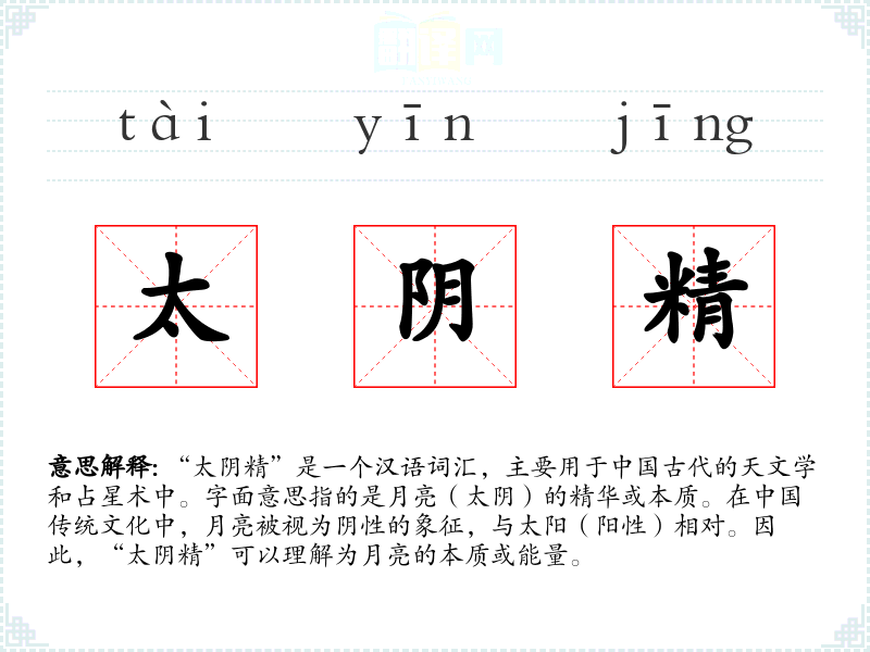 “太阴精”是一个汉语词汇,主要用于古代的天文学和占星术中。字面意思指的是月亮(太阴)的精华或本质。在传统文化中,月亮被视为阴性的象征,与太阳(阳性)相对。因此,“太阴精”可以理解为月亮的本质或能量。