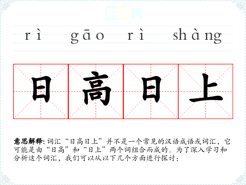 - 字面意思:由于“日高日上”不是一个标准词汇,我们可以将其拆分为“日高”和“日上”来理解。