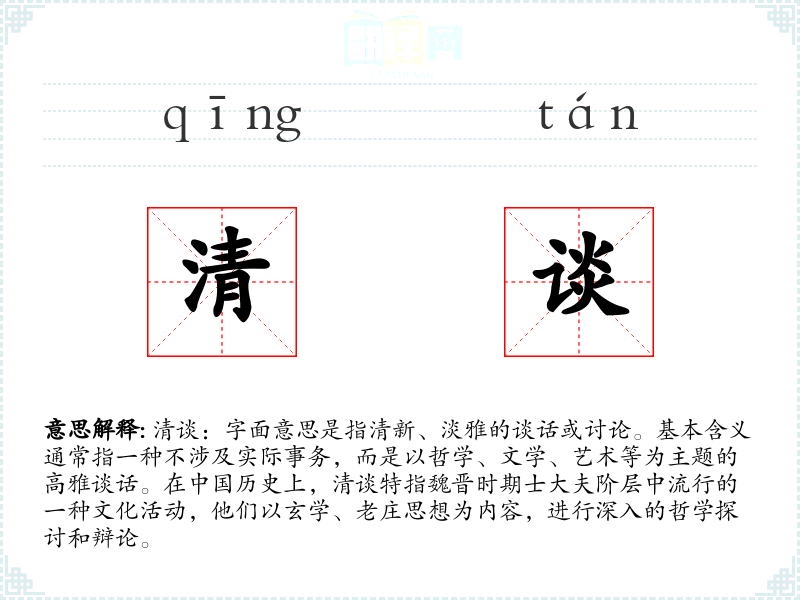 清谈:字面意思是指清新、淡雅的谈话或讨论。基本含义通常指一种不涉及实际事务,而是以哲学、文学、艺术等为主题的高雅谈话。在中国历史上,清谈特指魏晋时期士大夫阶层中流行的一种文化活动,他们以玄学、老庄思想为内容,进行深入的哲学探讨和辩论。