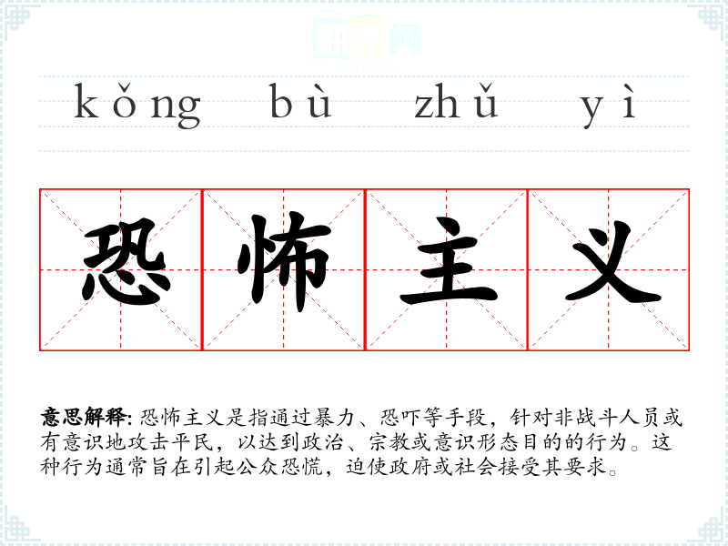 - 不同语言:在不同语言中,恐怖主义的对应词汇可能有所不同,但其核心含义相似,都指代政治暴力和恐吓行为。
