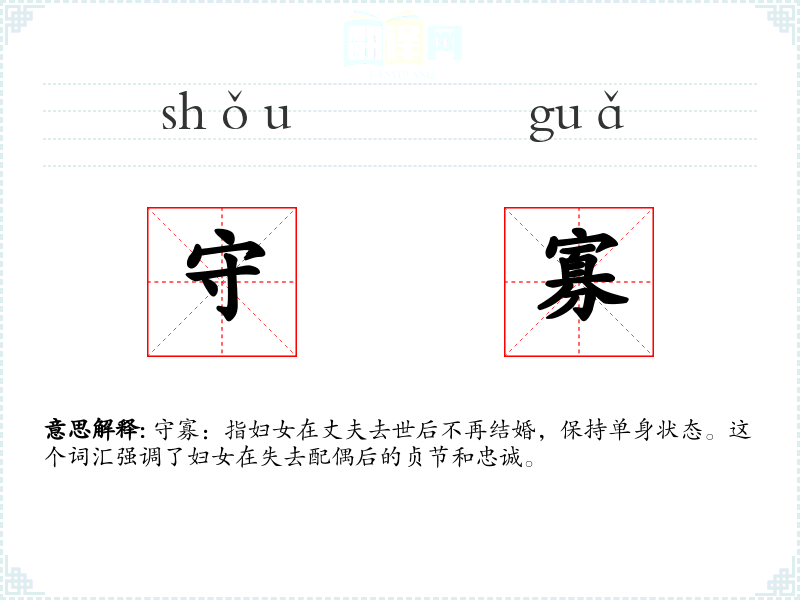 守寡:指妇女在丈夫去世后不再结婚,保持单身状态。这个词汇强调了妇女在失去配偶后的贞节和忠诚。