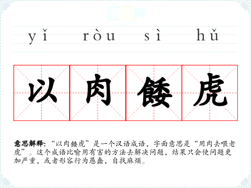 “以肉餧虎”是一个汉语成语,字面意思是“用肉去喂**”。这个成语比喻用有害的方法去解决问题,结果只会使问题更加严重,或者形容行为愚蠢,自找麻烦。