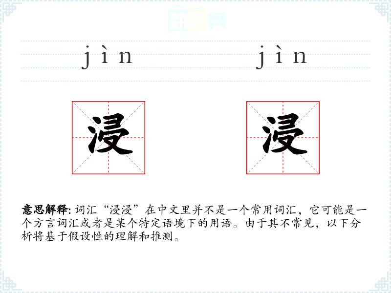 词汇“浸浸”在中文里并不是一个常用词汇,它可能是一个方言词汇或者是某个特定语境下的用语。由于其不常见,以下分析将基于假设性的理解和推测。
