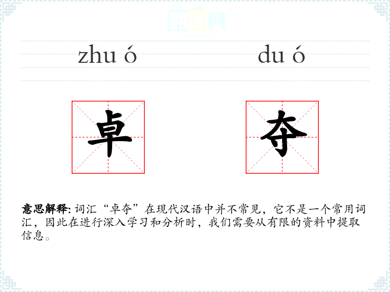 词汇“卓夺”在现代汉语中并不常见,它不是一个常用词汇,因此在进行深入学习和分析时,我们需要从有限的资料中提取信息。