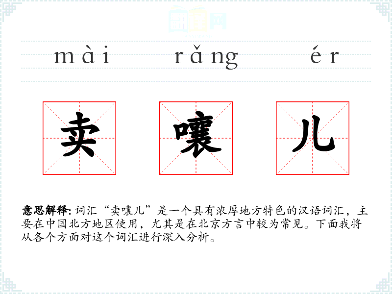 词汇“卖嚷儿”是一个具有浓厚地方特色的汉语词汇,主要在**北方地区使用,尤其是在北京方言中较为常见。下面我将从各个方面对这个词汇进行深入分析。